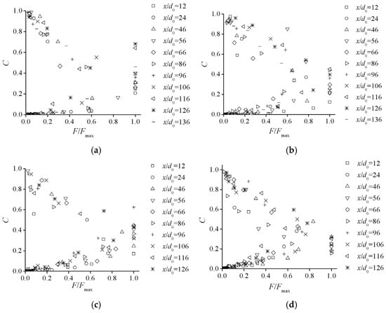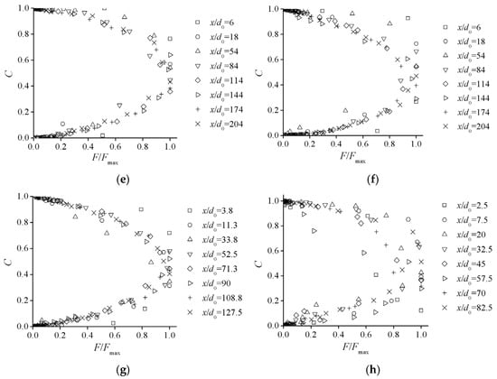 Comparing the distributions of F/Fmax(C) for identical α, the distribution profiles are almost the same with the variation of Re0. This indicates that the flow turbulence condition does not affect the development process of the air–water structure in self-aerated flows. For the identical flow turbulence conditions (Figure 6b,c,e), the frequency distribution is mainly similar in the low-air-concentration region, and the variation of slope mainly changes the F/Fmax(C) distribution in the high-air-concentration region. For a greater slope, as the air concentration and distance from free surface decrease, the variation gradient of air–water transfer frequency is greater than that for a small slope condition. This is mainly because the chute slope variation changes the air–water flow structure in the highly-aerated region.