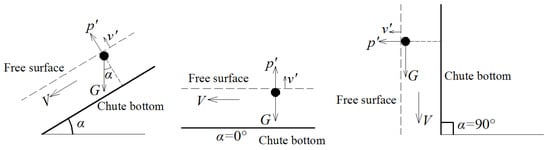 The effect of chute slope is mainly due to the change in the restraint of gravity on the surface movement under turbulent fluctuation pressure (p′) in the vertical direction, as shown in Figure 7. When α = 0°, the gravity G totally restrains the surface deformation in the vertical direction, while the effect of G on vertical direction is neglected when the flow is vertical wall-jet (α = 90°). Thus the scale of roughness decreases with the increase in chute slope, and the bubble entrainment and water drop formation occur much more easily. Based on the analysis in the above section, the pronounced preponderance of small bubble size in the high-concentration-region confirms this deduction (Figure 4). Small-scale air–water structures, like individual air bubbles, water drops, and small-scale roughness, make a great contribution to the air–water transfer frequency increase. For the low-air-concentration region, the air in the flow is mainly entrained individual bubbles for both small and large slopes; thus, the distributions of F/Fmax(C) remain unchanged.