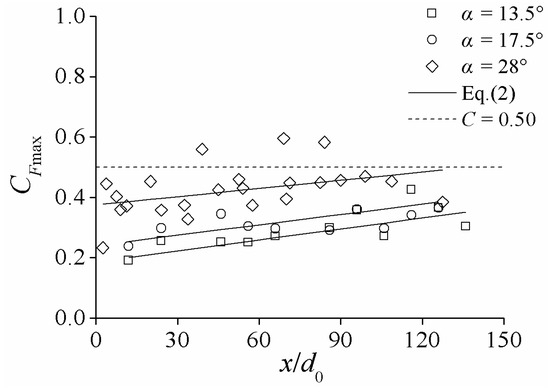 The air concentration of the maximum air–water transfer frequency fluctuates for different slope conditions, which is due to the non-uniform flow conditions. The average value at the same x/d0 CFmax is used to descript the development of air–water properties as the mixed flow develops downstream, as shown in Figure 8. CFmax increases gradually downstream as the process of air–water mixture development progresses. With α becoming larger, the value of CFmax increases and the maximum position of Fmax is located at a relatively higher-aeration zone. The air concentration of maximum frequency moves to the position where CFmax = 0.50. A previous study [16] showed that the bubble frequency profiles exhibited a maximum value at about C = 0.50 for fully developed uniform regions of self-aerated flow. It can be deduced from the data of the non-uniform region that the development of self-aeration is a process of air–water transferring equilibrium. Based on experimental data, CFmax in the non-uniform region can be represented by an approximate function of x/d0 and α, given as follows: