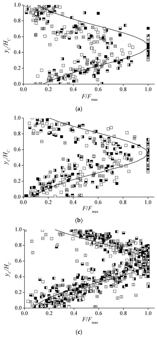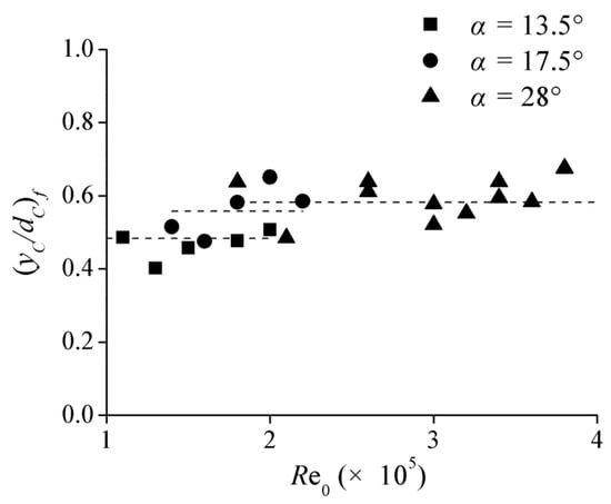 Figure 9 shows the air–water transfer frequency distributions in dC for different flow and slope conditions. The positions of maximum value F/Fmax oscillate for different flow cross-sections due to the present experimental flow with supercritical non-uniform conditions. The (yC/dC)Fmax represents the location of the Fmax in the self-aerated region for a certain α, and the self-aeration development hardly influences the distributions of air–water transfer frequency in the aerated region. For a certain chute slope condition, the distributions of F/Fmax show self-similarity as the function of yC/dC, with a decrease from the center of self-aeration to the upper and bottom boundaries. (yC/dC)f represents the average value of different cross-sections with the same flow turbulence Re0 conditions, and no clear trend is obtained for the effect of Re0, as shown in Figure 10. A simple normal distribution centered on (yC/dC)f is set to fit the F/Fmax distributions in dC as follows: