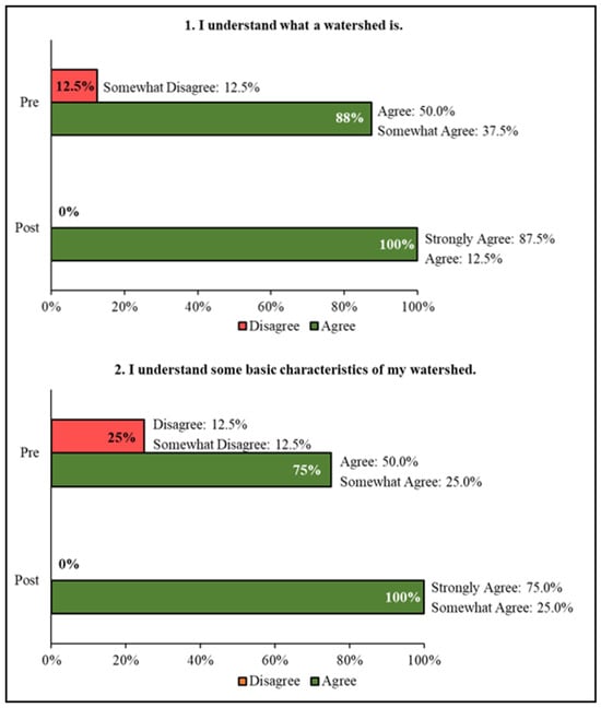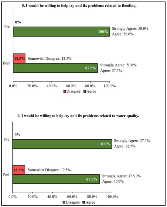 Conversely, the reported change in mean in questions 5 (−0.25) and 6 (−0.25) represented the greatest negative change. Questions 5 and 6 indicate that the student participants reported a decrease in willingness to address local flooding issues in their watershed (