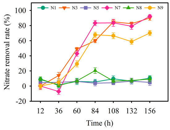 A total of nine denitrifying bacteria strains were isolated and purified (Table 1). Based on the colony morphology of the microorganisms on the plate, six strains (N1, N3, N5, N7, N8, and N9) were identified as bacteria, while the remaining strains (N2, N4, and N6) were identified as fungi. The denitrification rates of these six bacterial strains were analyzed under aerobic conditions at 15 °C (Figure 1). The nitrate removal rates of strains N1, N5, and N8 were consistently below 20%, while the rates of strains N3, N7, and N9 were above 50%. The final nitrate removal rates for strains N3, N7, and N9 were 89.94%, 92.24%, and 70.13%, respectively. Therefore, strains N3, N7, and N9 were selected for further study.