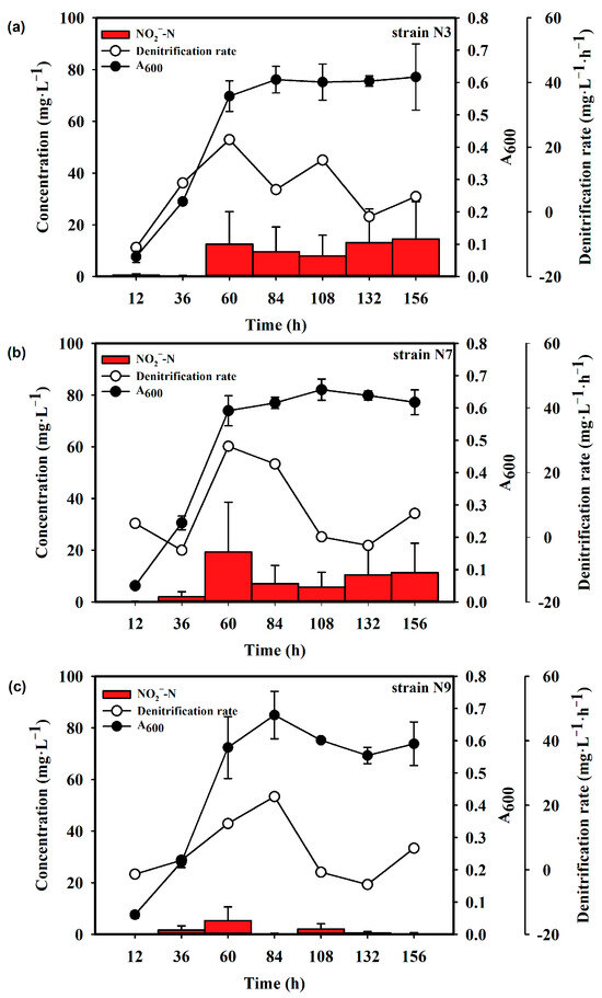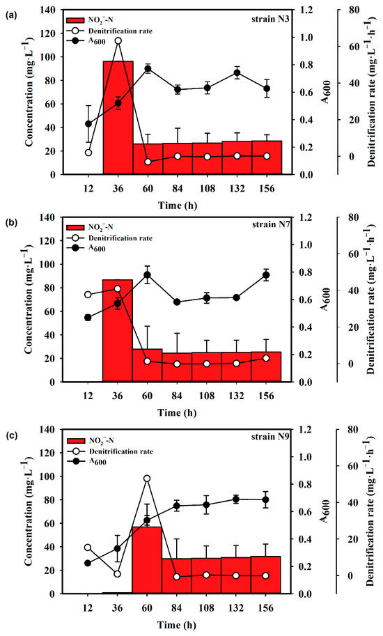 Strain N9 exhibited a longer logarithmic growth phase, lasting from 0 to 84 h. At 15 °C, the denitrification rate continued to increase during this phase, reaching a maximum of 22.69 mg·L−1·h−1 at 84 h. Nitrite accumulation was minimal, with the highest content being 5.31 mg·L−1 at 60 h (Figure 2c). At 30 °C, strain N9 showed its peak denitrification rate, which achieved 53.09 mg·L−1·h−1, and highest nitrite accumulation at 60 h (Figure 3c).