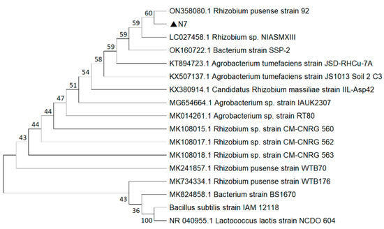 The 16S rRNA sequencing of strain N7 yielded a sequence length of 1349 bp (GenBank: PV413231.1). The similarity between strain N7 and Rhizobium pusense 92 was more than 99%. The constructed phylogenetic tree is shown in Figure 4, confirming the identification of strain N7 as Rhizobium pusense. Therefore, we named this strain Rhizobium pusense N7.