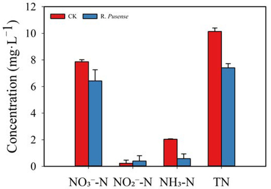 Wastewater from black carp was taken into conical flasks (nitrate 7.87 mg·L−1, nitrite 0.23 mg·L−1, ammonia 2.03 mg·L−1, total nitrogen 10.14 mg·L−1, pH 7.84). Rhizobium pusense N7 was added and cultured at a concentration of 107 CFU·mL⁻¹ under optimal denitrification conditions (30 °C, shaker speed 100 rpm) for 24 h. Sodium succinate was added to achieve a C/N ratio of 15:1. Nitrate, nitrite, ammonia and TN concentrations were determined using a spectrophotometric method with a Flow Injection Analysis instrument (FIA, QC8500, HACH, Loveland, CO, USA).