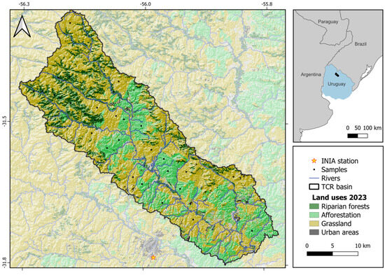 The study area is in northern Uruguay, specifically within a sub-basin of the Tacuarembó River Basin, the Tres Cruces River basin (TCR, Figure 1), which covers an area of 916.6 km2. This basin was chosen due to its representativeness of key land uses of interest: afforestation, grassland, and riparian forests in the Pampa biome.