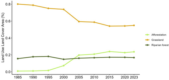 - Cano, D.; Cacciuttolo, C.; Custodio, M.; Nosetto, M. Effects of Grassland Afforestation on Water Yield in Basins of Uruguay: A Spatio-Temporal Analysis of Historical Trends Using Remote Sensing and Field Measurements. Land 2023, 12, 185. [Google Scholar] [CrossRef]