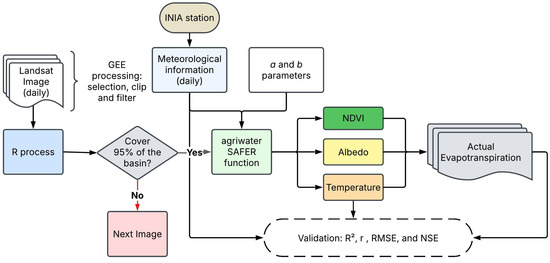The data processing (Figure 3) was significantly simplified by utilizing the ‘agriwater’ R package. For each Landsat image (Table 1), the corresponding meteorological data were integrated to facilitate the execution of the package’s function. This function applies the set of equations and parameters presented in Section 2.3 to derive the ETa estimates; detailed information is provided in Silva et al. [9,34].