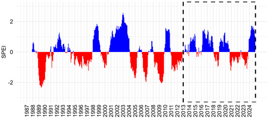 Standardized Precipitation Evapotranspiration Index (SPEI) from 1987 to 2024; data from the INIA meteorological station. The dashed black lines represent the studied period from 2014 to 2024.