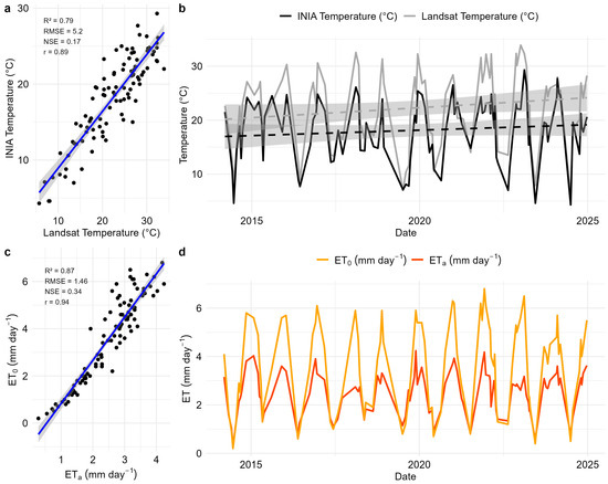 (a,b) Surface temperature from Landsat and (c,d) actual evapotranspiration ( from SAFER estimation validation using temperature and potential evapotranspiration ( from INIA meteorological station data from 2014 to 2024.