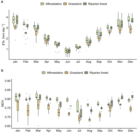 Complementary information on vegetation vigor is provided by the monthly normalized difference vegetation index (NDVI) shown in Figure 6b. The NDVI shows that riparian forests (January = 0.82 ± 0.01 and July = 0.72 ± 0.03) and grassland (January = 0.76 ± 0.05 and July = 0.68 ± 0.03) adapt to seasonal and hydrological characteristics, while the exotic vegetation used in afforestation maintains high vigor throughout the year (January = 0.81 ± 0.02 and July = 0.76 ± 0.04). NDVI values peak during the spring and summer months (October to March), indicating higher photosynthetic activity and increased plant biomass, and decline in autumn and winter (April to September). Notably, afforestation areas show the highest NDVI values, followed by riparian forests and then grasslands. This pattern reinforces the observation that exotic vegetation used in afforestation maintains high vigor throughout the year, associated with higher water consumption, as evidenced by its elevated . The alignment of seasonal NDVI and patterns suggest a direct relationship between photosynthetic activity, biomass accumulation, and water consumption across these land uses.