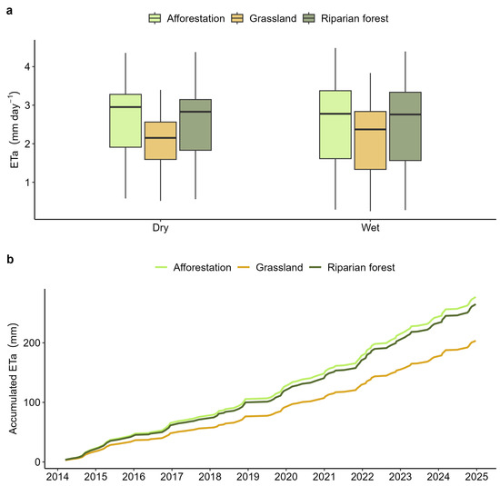 Second, to gain a broader spatial and temporal perspective on total water consumption, daily values were accumulated. Since afforestation covers less than half the area of grassland, a hypothetical scenario assuming equal area coverage was examined by compiling accumulated values from 10 representative samples for each land use (Figure 1). The results reveal that, when normalized for the area, in afforestation is 26.50% higher than in grasslands and 4.79% higher than in riparian forests (Figure 7b).