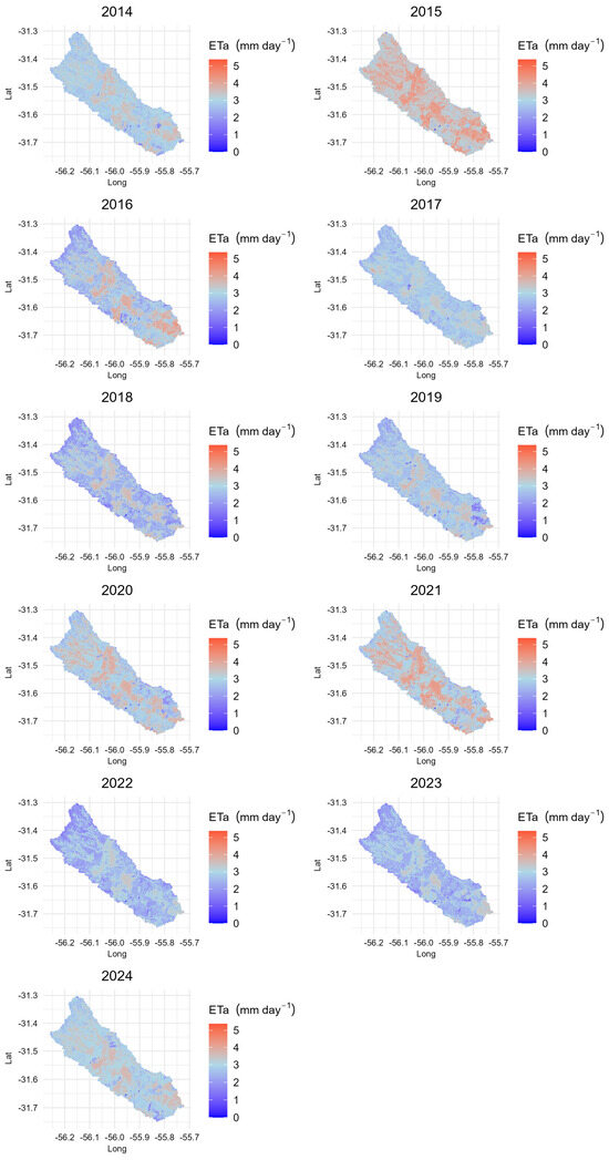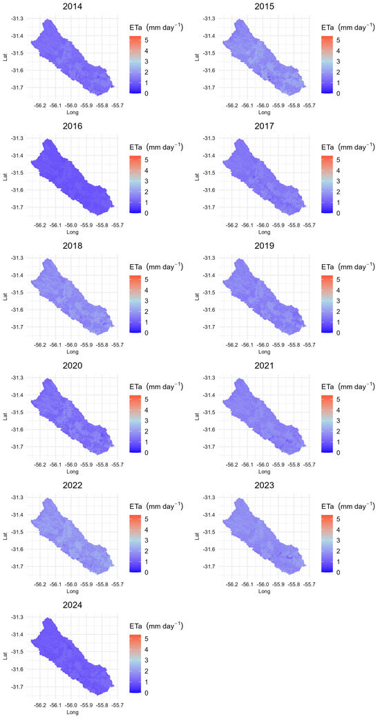 Average actual evapotranspiration maps for summer months from 2014 to 2024.