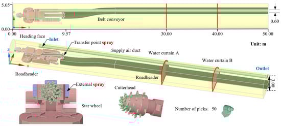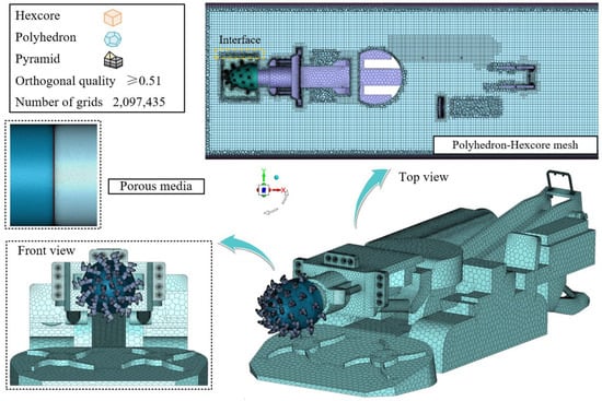 A Polyhedron-Hexcore mesh was employed in this study, combining polyhedral cells near boundaries with hexahedral cells in the primary flow regions, and using pyramidal cells for smooth transitions. This hybrid approach provides the adaptability of polyhedral elements alongside the accuracy and efficiency of hexahedral grids, making it well suited for large-scale simulations. As shown in Figure 2, the final mesh consists of 2,097,435 cells with a minimum orthogonal quality above 0.51. The water curtains were treated as porous media to capture their impact on airflow. Local mesh refinement was carried out around critical areas—including the rotating cutterhead (fitted with 50 picks), the main body of the roadheader, and zones exhibiting substantial flow variations—to accurately represent complex geometries. By increasing mesh density in these regions, the model achieves higher simulation fidelity and detailed flow characterization. To handle the rotating cutterhead domain, an interface was established between the rotational and static zones, ensuring accurate data exchange and seamless integration across fluid regions. This setup strikes a balance between precision and computational efficiency, allowing the mesh to represent intricate equipment features while maintaining manageable memory requirements.