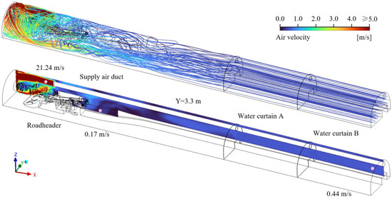 The distribution of airflow streamlines and velocity variations within the heading tunnel is shown in Figure 3 under halted operations, where excavation has been suspended and no dust is generated. As a result, both the spray system and dust control water curtains are turned off. Fresh air enters the tunnel through the supply duct at an initial velocity of about 21.24 m/s near the duct exit. When this incoming flow encounters the heading face, it is obstructed and deflects toward the rear, resulting in a large-scale vortex in front of the heading face. Meanwhile, a noticeable velocity drop is observed around the roadheader, with the air velocity behind the machine decreasing to as low as 0.17 m/s. By contrast, airflow on the return side maintains a relatively high velocity of about 3–5 m/s. Farther along the tunnel toward the outlet, the flow velocity gradually declines, eventually reaching a minimum of 0.44 m/s at the outlet.