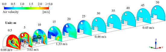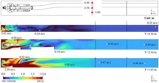 The spatial distribution of air velocity at three representative cross-sections within the tunnel, located at Y = 1.03 m (return side), Y = 2.54 m (tunnel central), and Y = 4.36 m (intake side), is shown in Figure 5. Overall, the air velocity decreases significantly along the tunnel length and exhibits notable spatial variations. At Y = 1.03 m, the air velocity at the front of the tunnel reaches 2.50 m/s. However, after passing the roadheader area, the velocity drops sharply to 0.52 m/s, further decreasing to around 0.46 m/s near the outlet. At Y = 2.54 m, the air velocity exceeds 2.0 m/s in the region ahead of the roadheader. Due to obstruction and turbulence caused by the roadheader, the air velocity directly above the machine significantly drops to 0.89 m/s. As the tunnel extends, the velocity stabilizes, remaining around 0.40 m/s near the outlet. At Y = 4.36 m, a large high-velocity area is observed at the tunnel’s entrance, with a peak velocity of 5.62 m/s. However, as the airflow moves along the tunnel, it decreases rapidly, reaching 0.33 m/s at the outlet.