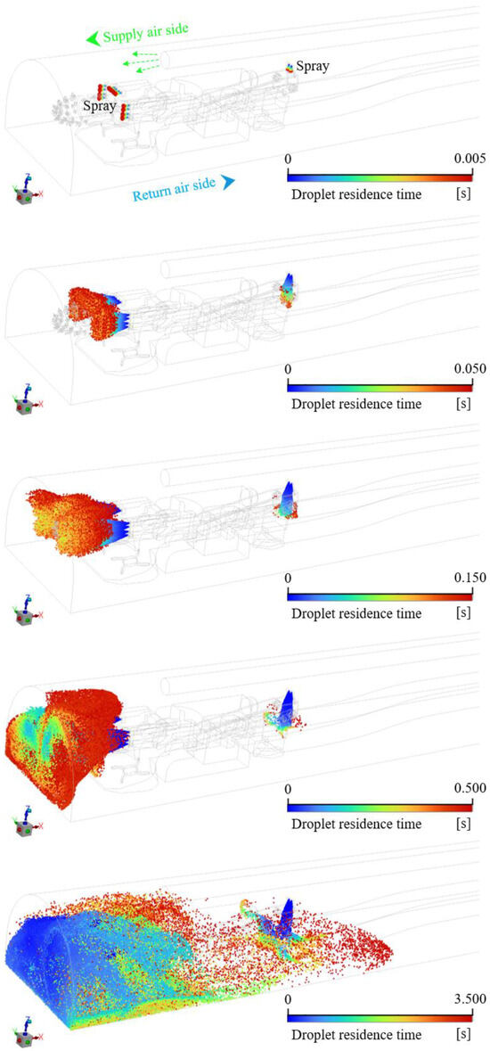 The trajectories and residence time distributions of droplets released from spray systems positioned at the cutter boom and transfer point within the excavation roadway are illustrated in Figure 7, depicting the dynamic evolution of droplet dispersion at different moments in time. Initially, droplets exit rapidly from the nozzles, dispersing outward in a conical pattern. Specifically, the external spray comprises twelve nozzles arranged circumferentially above the cutterhead, effectively encapsulating and suppressing dust generated during excavation. Under the influence of forced ventilation, droplets predominantly migrate toward the return side. At 0.5 s after spray initiation, droplets originating from the cutterhead region expand significantly toward the rear of the tunnel, forming a broader dispersion area with notably increased residence time, as indicated by the progressive color shift from blue-green (short residence) toward red (long residence). Concurrently, droplets emitted from the transfer point spray system remain primarily localized near the roadheader’s rear, forming a relatively compact area with prolonged droplet residence. By 3.5 s, droplets have extensively dispersed throughout the excavation workspace, reaching a stable spatial distribution. Droplets from the transfer point system notably spread downstream along the roadway toward the rear and bottom areas, showing significantly prolonged residence time. Overall, the dynamic dispersion process highlights substantial non-uniformity driven by complex interactions between airflow patterns and structural interference from the excavation equipment, providing valuable insights for optimizing dust suppression performance.