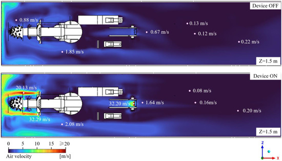 The spatial distributions of air velocity at the Z = 1.5 m cross-section under conditions with the device off (spray and water curtain off) and the device on (spray and water curtain on) are illustrated in Figure 8. Under the device OFF condition, the air velocity inside the tunnel is generally low, with a peak velocity of approximately 0.88 m/s near the cutterhead, while the air velocity around the roadheader tail is considerably lower, ranging between 0.12 and 0.67 m/s. With activation of the spray systems, the introduction of high-velocity droplets significantly enhances localized airflow, particularly near the cutterhead region, where the maximum velocity sharply increases to approximately 32.29 m/s. Similarly, the airflow induced by the transfer point spray also exhibits a pronounced increase, reaching a velocity of up to about 33.00 m/s near the spray nozzle and approximately 10.0 m/s in the adjacent region. Due to obstruction by the sidewalls of the conveyor, the airflow is predominantly redirected along the ±X directions. The significant enhancement in local air velocity demonstrates strong momentum exchange between the spray droplets and surrounding air, yet this effect diminishes considerably toward the outlet. These observations indicate that while spray-induced jets can greatly improve local airflow dynamics and potentially enhance dust suppression near key operational areas, their influence on distant regions of the tunnel remains limited due to airflow attenuation and structural interference.