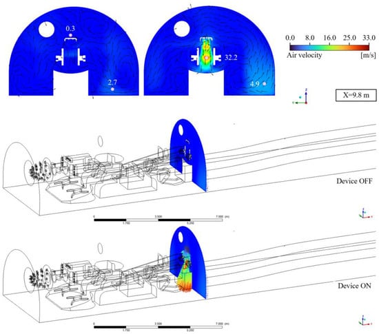 Airflow field comparison near the cutterhead under device OFF and ON conditions.