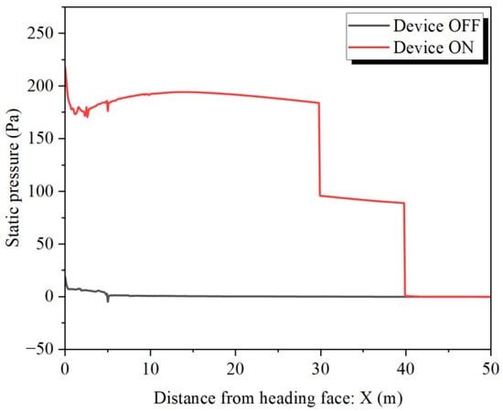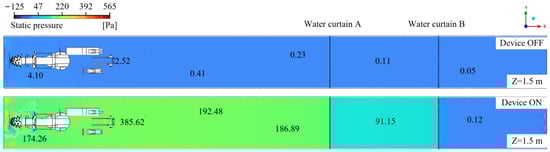 The static pressure distributions at the Z = 1.5 m cross-section under device OFF and ON conditions are presented in Figure 11. Under the device OFF condition, the static pressure throughout the tunnel remains relatively uniform and slight, ranging between approximately 4.10 Pa near the roadheader and 0.05 Pa at the outlet. Upon activating the spray and water curtain devices, significant alterations in the static pressure distribution are observed. Notably, a marked high-pressure region develops downstream of the roadheader, with maximum static pressures reaching up to 385.62 Pa near the transfer point area. The presence of water curtains A and B further influences the pressure distribution, inducing stepwise pressure drops across each curtain, with pressures recorded at approximately 186.89 Pa after water curtain A and 91.15 Pa after water curtain B. Near the cutterhead, a distinct pressure region (174.26 Pa) emerges due to the intense momentum exchange associated with spray-induced airflow acceleration. The overall pressure gradient reflects increased airflow resistance and local dynamic disturbances resulting from spray and water curtain operations.