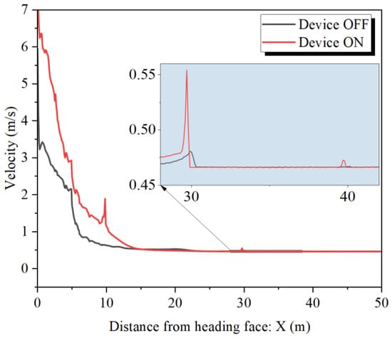 As shown in Figure 12, the area-weighted static pressure increases significantly when the dust suppress devices are activated. Under the device OFF condition, the static pressure remains relatively low. By contrast, under the device ON condition, the static pressure near the heading face rises rapidly, reaching around 200 Pa within the first 10 m. A distinct two-step pressure drop appears downstream of the curtain: at X = 30 m, the static pressure falls abruptly from 180 Pa to 90 Pa. At X = 40 m, the pressure declines further to near-ambient levels, indicating that the combined resistance of the water curtain is no longer dominant and the airflow has re-equilibrated with the main ventilation stream. These two pressure inflection points delineate the effective influence zone of the suppression devices (0–40 m). Beyond 40 m, the pressure profiles for the ON and OFF cases converge, implying negligible impact on the downstream ventilation network. In Figure 13, the area-weighted velocity also shows a clear increase when the spray system is activated. Under the device OFF condition, the velocity remains relatively low, with the highest velocity at X = 1 m being approximately 3.4 m/s. However, with the devices on, the velocity increases sharply to reach a maximum of 6.3 m/s. A notable feature is the sharp rise in velocity, especially between 0 and 20 m from the heading face. The inset in Figure 13 provides a more detailed view between 30 and 40 m, where the velocity stabilizes around 0.45 m/s, with the fluctuations attributed to the obstructive effect of the water curtain on the airflow.
