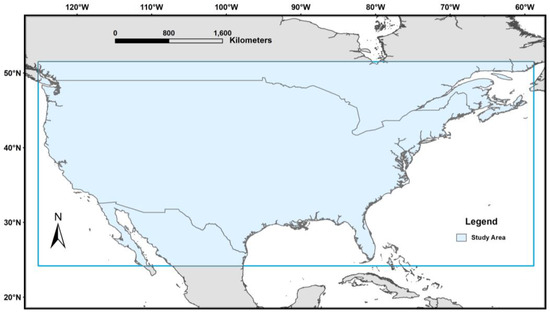 For the case, a rectangular area in North America that includes the contiguous United States, southern Canada, northern Mexico, and the northern Bahamas (Figure 1) was delineated as the study area over the range of 24.2° N~51.5° N latitude and 125.2° W~58.8° W longitude. The study area is characterized by various landforms, with hills in the east, vast plains spread in the middle, and plateaus/mountains dominating the western part. The climate of the study area is mainly temperate and subtropical. The total geographical area of the study area is about 11,970,000 km2.