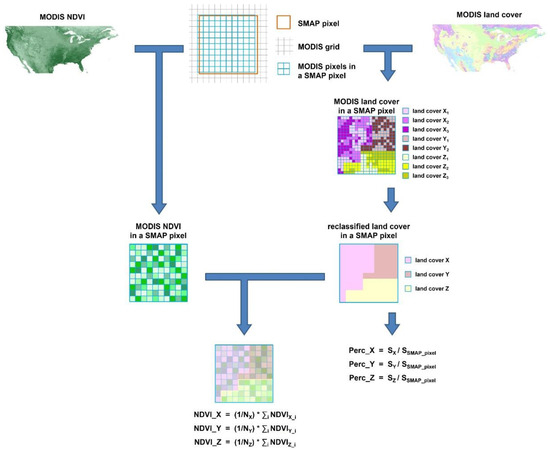 Figure 2 illustrates the calculation of “percentages of typical land cover classes” and “average NDVIs corresponding to typical land cover classes” in a SMAP pixel. Here, the details in one SMAP pixel are displayed for better explanation. For example, X1, X2, and X3 are land cover classes in MODIS land cover data (MCD12Q1). Supposedly, according to the reclassification scheme stated above, they belong to one of the typical classes, X. Then, the percentage of the typical class X in the SMAP pixel is calculated as the area of X (SX, equal to the sum area of X1, X2, and X3 in MODIS land cover data) divided by the area of the SMAP pixel (SSMAP_pixel), while the average NDVI corresponding to the typical class X in the SMAP pixel is calculated as the sum of NDVI values corresponding to X land cover class (ΣiNDVIX_i, i = 1, 2, …, NX) divided by the number of pixels corresponding to X land cover class (NX). Relevant variables for land cover Y and Z can also be calculated.