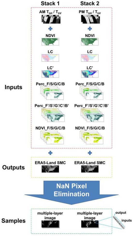 Then, these raster layers on each date of interest were stacked to construct the samples. The ERA5-Land modeled SMC was set as the output parameter and the others as input parameters. Furthermore, for SMAP brightness temperature data, there are two overpasses in a day at local time (6 a.m./6 p.m.), which also differ in footprints and distribution of available observations. Therefore, setting brightness temperatures of AM/PM overpasses as input parameters may bring about discrepancies in SMC retrieval. Two stacking methods were used to investigate this discrepancy (presented in Figure 3). In Stacks 1, the brightness temperatures of AM overpasses were used, whereas in Stacks 2, the brightness temperatures of PM overpasses were used. After layer stacking, the “NaN pixel elimination” procedure was conducted. As mentioned above, there were some invalid data for each raster layer, such as RFI pixels in AM/PM TbH/TbV layers and water body pixels in land cover layers. The pixels containing invalid data in one or more layers should be eliminated because they could not form integrated samples. Therefore, the remaining pixels with data from all valid layers were retained and ready for sample formation.