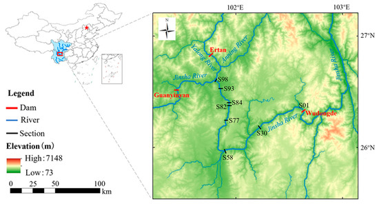 The study area covered the river section from the Sanduizi hydrological station (S98) to the WDD dam site (S01), simulating the impact of daily operations on the hydrodynamic conditions of this river section. The total length is 198 km, with a total of 98 measured cross-sections. During the calculation, these cross-sections were interpolated and divided into 446 sections with intervals ranging from 350 to 500 m. The upstream boundary conditions were determined by considering the hourly discharge of the Sanduizi hydrological station, and the downstream boundary conditions were determined by considering the hourly outflow from the WDD station.