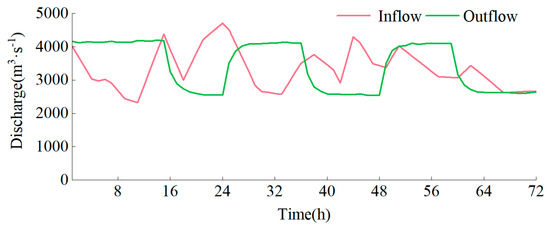 We selected measured data from 11 November 2020 to 13 November 2020 for model validation. The fluctuation range of inflow is between 2330 and 4710 m3/s, exhibiting a pattern of ‘two rises and two falls’ each day. The outflow fluctuates between 2540 and 4200 m3/s, with one rise and fall occurring each day, resulting in a daily variation of 1660 m3/s. This process is shown in Figure 2. The initial condition is the water level (965.5 m) of the WDD dam site (S01) at 00:00 on 11 November 2020.