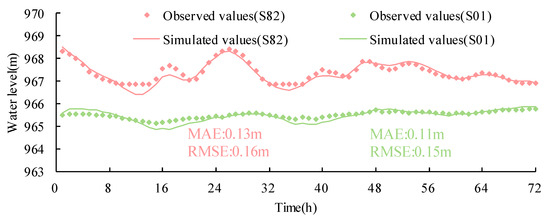 Comparison of the observed and simulated water levels at S01 and S82.