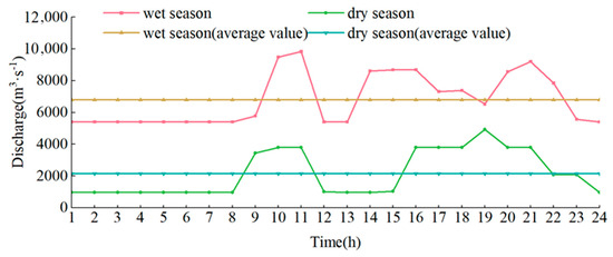 The typical daily scheduled processes of the WDD power station during the wet and dry seasons under hydro-PV complementarity are illustrated in Figure 4. The discharge values used in the different scenarios are based on design assumptions derived from the typical regulation guidelines of the cascade system. These assumed values represent typical turbine operation flows under the corresponding RWL conditions and are used to ensure a consistent comparison across scenarios. The output of the hydropower station unit and the photovoltaic output show complementary anti-regulation characteristics, and the hydropower output is reduced during the period of sufficient light (11:00–16:00). In the wet season, the flow ranges from 5400 to 9830 m3/s during typical daily scheduled processes, with an average flow of 6787 m3/s and a variation of 4430 m3/s. In the dry season, the flow ranges from 960 to 4927 m3/s during typical daily scheduled processes, with an average flow of 2152 m3/s and a variation of 3967 m3/s.