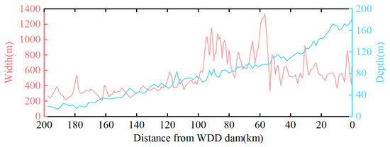 As shown in Figure 5, the width of the river in the WDDR at the normal storage level varies from 200 m to 1400 m. The average river width of the 50 km pre-dam is 570 m, the average river width of the 50–100 km pre-dam is 825 m, and the average river width of the 100 km river channel in the reservoir tail is 350 m. The average water depth shows an overall increasing trend along the river channel; from upstream to downstream, the water depth gradually increases from 14 m to 180 m.