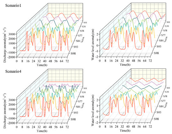 The simulation results for typical sections under daily operation of upstream power stations (DOUPS) are shown in Figure 6. The water level and discharge in the reservoir area exhibited daily fluctuations. During the DOUPS (Scenarios 1 and 4), as the inflow fluctuates with three rises and falls daily, the water level in the reservoir tail also shows a corresponding pattern of three rises and falls per day. The WLFs generated upstream propagate downstream in the form of gravity waves, causing successive WLFs in various downstream sections.