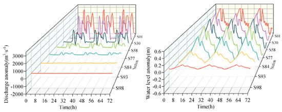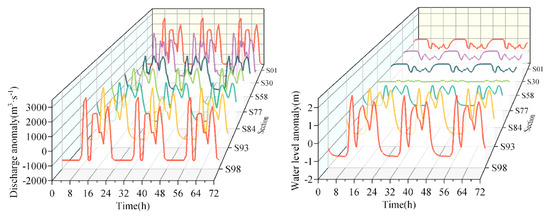 The simulation results (Scenario 7) of typical sections under the daily operation of downstream power stations (DODPS) are shown in Figure 7, and the WLF in the pre-dam area is the largest. From S01 to S98, the daily fluctuations in the water level and discharge gradually smoothed. From the pre-dam to the upstream, the daily variation in the water level in the reservoir area first decreases and then increases slowly. This is because the width of the reservoir increases upstream, and the water depth decreases, resulting in an increase in daily variation. Near the reservoir tail, the daily variation in the water level decreases rapidly because the reservoir tail has a greater slope, increasing the resistance to waves and weakening the wave energy. Additionally, the shallow depth near the reservoir tail enhances wave energy attenuation due to increased bottom friction.