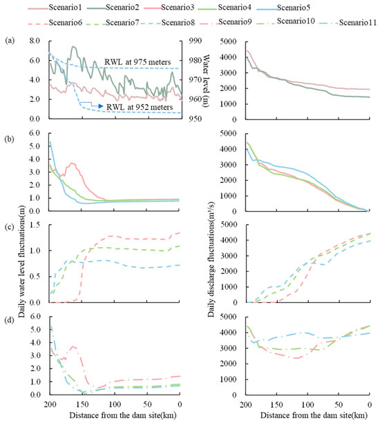The higher the RWL, the smaller the daily variation in the water level. The daily variation in the pre-dam water level at 952 m RWL (Scenario 6) is 1.34 m, and that at 975 m RWL (Scenario 7) is 1.09 m. This is because the increased water depth enhances the reservoir’s storage-buffering capacity, thereby reducing the sensitivity of the water level to unit discharge variations. When the RWL is 975 m, the daily variation in the water level during the wet season is larger than that during the dry season. The daily variation in the pre-dam water level in Scenario 8 is 0.72 m, which is smaller than the 1.09 m in Scenario 7. First, flow variation in the wet season is inherently larger than that in the dry season. Second, under the same flow variation, scenarios with larger inflows cause greater variation in the water level.