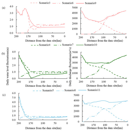 During the joint daily operation of cascade power stations (JDOCPS) (Figure 9d), when the reservoir is impounded at 975 m in the wet season (Scenario 10) and dry season (Scenario 11), the 50 km section of the reservoir tail and 150 km section of the main reservoir area are affected by the inflow and outflow of the reservoir, respectively, and the daily WLF decreases monotonically, reaching a minimum near S77 (150 km pre-dam), with amplitudes of 0.08 m and 0.20 m, respectively. The minimum amplitude position is related to the RWL, and the reduction amplitude is associated with the scheduled flow. In the wet season, when the reservoir is impounded at 952 m (Scenario 9), the daily WLF in the 50 km upstream section is unaffected by backwater and remains consistent with the natural outflow. The WLF in the remaining reaches is the same as that in Scenarios 10 and 11, reaching a minimum near S69 (125 km pre-dam), and the amplitude is 0.53 m.