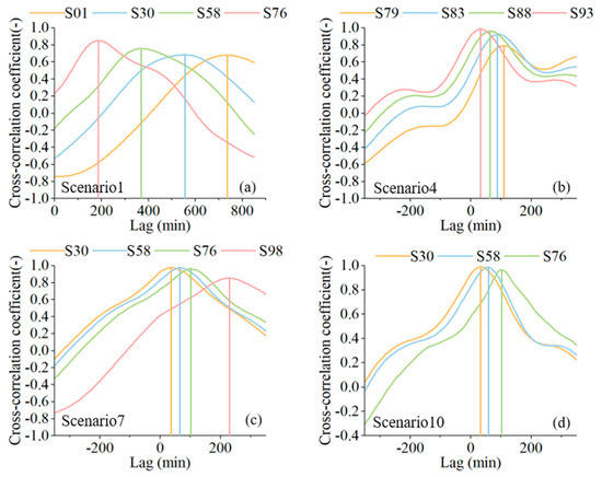Cross-correlation diagrams for Scenario 1 (a), Scenario 4 (b), Scenario 7 (c), and Scenario 10 (d).