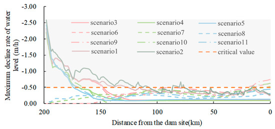 A rapid WLF within a day has an impact on reservoir bank slope stability and endangers reservoir safety. Under the influence of daily operations, when the RWL decreases, the pore pressure on the slope surface and slope bottom decreases, leading to directional seepage flow. As a result, fine soil particles are carried away by seepage forces, leaving behind a large-pore framework. A decrease in soil compaction implies a decrease in stiffness and strength, which may result in slope instability [34]. Among these factors, the rate of decrease in the RWL had a significant impact on slope stability, with the stability coefficient of the reservoir bank slopes decreasing as the rate of decrease in the RWL increased. According to previous studies, the critical rate of decrease in RWL is approximately 0.5 m/h [34]. In Figure 14, the maximum rate of decrease in the water level along the river channel under the 11 scenarios is calculated, which is similar to the daily fluctuation trend of the water level. The possible instability range is determined by identifying river segments where the rate of decrease in the RWL exceeds the critical value of 0.5 m/h. The possible instability ranges for the 11 scenarios are listed in Table 4.