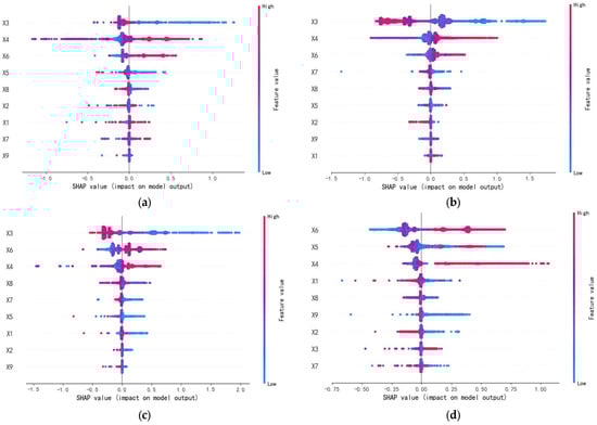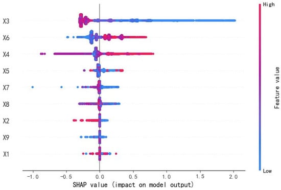 Figure 2 reveals that the SHAP value for DO (X3) spans the widest range, underscoring its predominant influence on water quality. An increase in DO (X3) positively affects water quality. Conversely, TP (X6) and the CODMn (X4) significantly negatively impact water quality as their levels rise. NH3-N (X5), TN (X7), and electrical conductivity (X8) also affect water quality to some extent. Water temperature (X1), turbidity (X9), and pH (X2) exhibit SHAP values fluctuating around zero, indicating a minor impact on water quality, as evidenced by their narrow range and balanced red–blue proportions. Notably, increases in TP (X6), permanganate (X4), NH3-N (X5), and TN (X7) may contribute to water quality degradation [29].