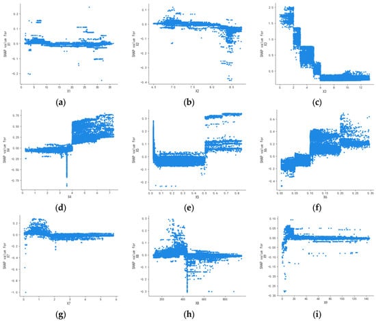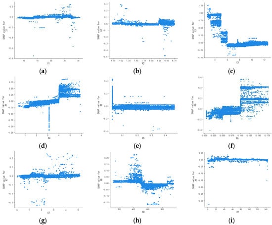 Single-factor dependence plots for summer: (a) X1, (b) X2, (c) X3, (d) X4, (e) X5, (f) X6, (g) X7, (h) X8, and (i) X9.