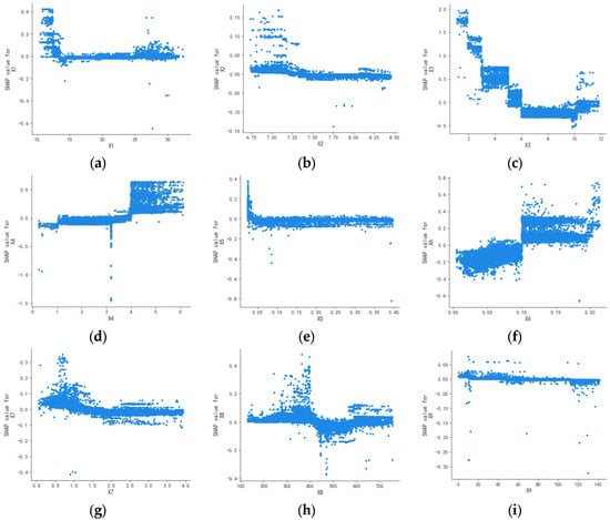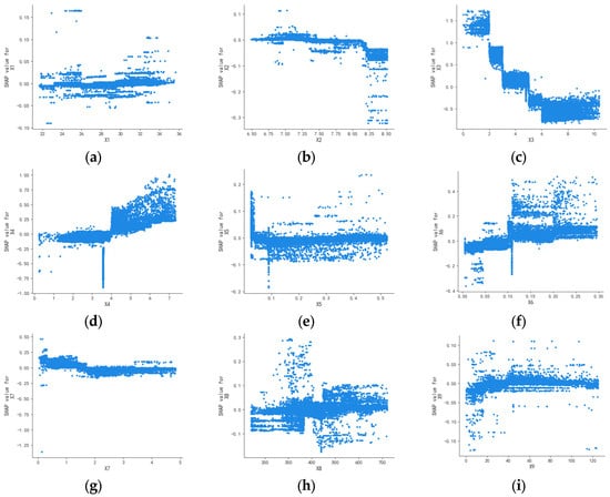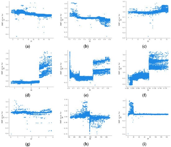 Single-factor dependence plots for all data: (a) X1, (b) X2, (c) X3, (d) X4, (e) X5, (f) X6, (g) X7, (h) X8, and (i) X9.