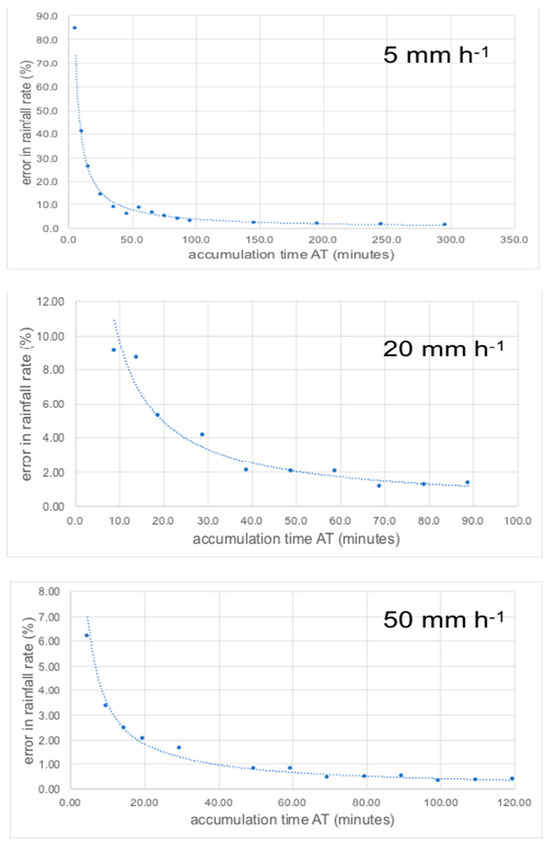 For rain at moderate intensity (5 mm h−1), worst-case errors in rainfall rate (Ierr) included 84.6% (for a 10 min AT) and 41.2% (15 min AT), declining to 6.2% (for a 50 min AT).