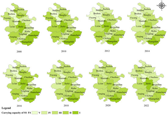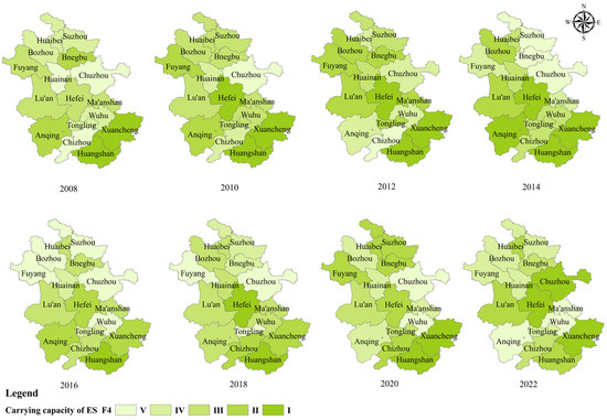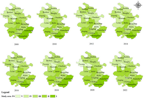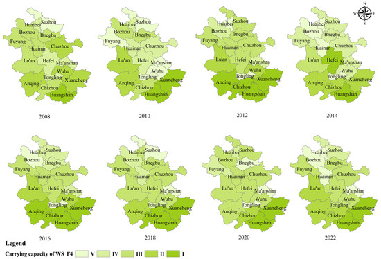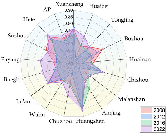 - The DCC of the WSE system’s carrying capacity also showed a fluctuating upward trend, gradually transitioning from level 6 to level 9. The level of Southern Anhui was greater than that of Central Anhui and Northern Anhui, with a more significant increase. The DCC of Central Anhui surpassed that of Northern Anhui.