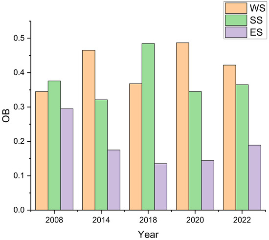 - The OD order of the criterion layer of WR-WECC is WS > SS > ES, where the OD of ES generally shows a downward trend, whereas the OD of WS and SS generally shows an upward trend. Northern Anhui is affected mainly by WS, whereas the central Anhui and southern Anhui regions are restricted by SS. At the index level, the water supply modulus, the water production modulus, and the proportion of tertiary industry are the main obstacle factors restricting the improvement of the AP WR-WECC. The water yield modulus, WR per capita, and forest coverage rate were the main factors influencing Northern Anhui. The restriction of Central Anhui was the same as that in Northern Anhui. The factors restricting the utilization rate of WRs, the proportion of the tertiary industry, and the forest coverage rate in the southern Anhui area are as follows.