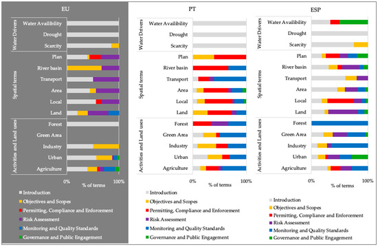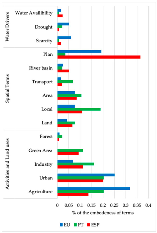 Compared with the EU, the Portuguese regulation refers to “scarcity” or “drought” much less frequently, though “drought” is slightly more referred to than “scarcity”. References to “water availability” are minimal and appear even less frequently than in the EU regulation. Spatial terms, like “area” and “land”, are only marginally more referred to than in the EU regulations. However, terms like “local” or “territory” have higher occurrences. Although “plan” is mentioned in the Portuguese regulation, it is scarcely referred to in comparison to the other documents. Unlike the EU Regulations, where references to “plan” are mainly related to management plans, in Portugal, they are related to landscape and river basin management plans. For land use-associated terms, despite following the pattern of the EU regulations, showing a stronger embeddedness of terms regarding “agriculture” and “urban”, though on a smaller scale, it shows a stronger emphasis on “industry” and “green areas”.