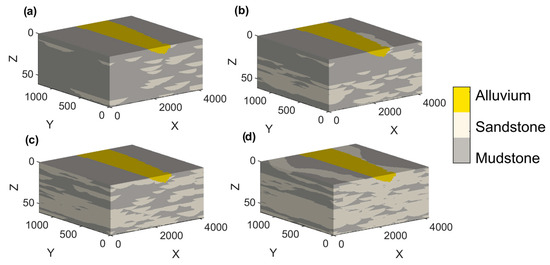 Simulated lithofacies, for example, realizations with channel fractions of (a) 20%, (b) 35%, (c) 50%, and (d) 75%. Distances along each axis are reported in meters.