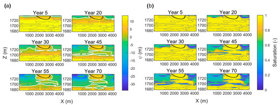 The (a) pressure head and (b) saturation results for an example realization (35% channel fraction). Results are displayed for model row 70. The black line indicates the extent of the alluvium, and the white line in (a) represents a pressure head of 0 m.