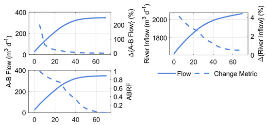 Simulated alluvial-to-bedrock aquifer flow (A-B flow) and river inflow with associated percent change (Δ{A-B Flow} and Δ{River Inflow}) and ABRF for example of realization with 35% channel fraction.