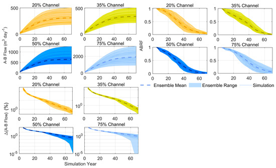 The final A-B flow percentage change (Δ{A-B Flow}) ranged from −0.04 to 2.1%, with ensemble means of 0.53%, 0.32%, 0.25%, and 0.68% for channel fractions of 20%, 35%, 50%, and 75%, respectively (Table 2). A negative percent change signifies a decrease in the A-B flow rate between successive timesteps, suggesting stabilizing A-B flow rates and hydraulic disconnection. The ensemble mean showed no clear trend with channel fraction. Most simulations had a final Δ{A-B Flow} below 1%, indicating minimal flow change with successive lowering, except for ten 75% channel fraction scenarios. The σ value, ranging from 0.1 to 0.45, and CV, ranging from 0.28 to 0.66, generally increased with channel fraction, indicating greater variability at higher fractions. As in the representative scenario, Δ{A-B Flow} decreased rapidly in the first 10 years and then asymptotically approached zero for the duration of the simulations.